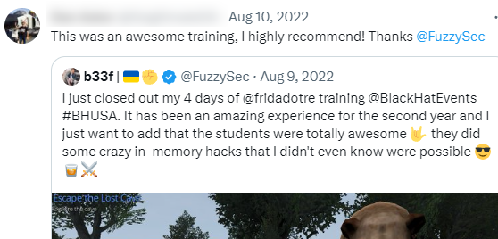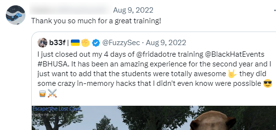 Ruben's Frida training is an excellent introduction to a topic that is difficult to find material for, using Frida with x86/x64 applications. Real world examples are explored which build confidence in using Frida for reverse engineering, with applications relevant to red teaming. The course has greatly improved the time it takes for me to gain an understanding of the applications I'm reversing, and I highly recommend the course.